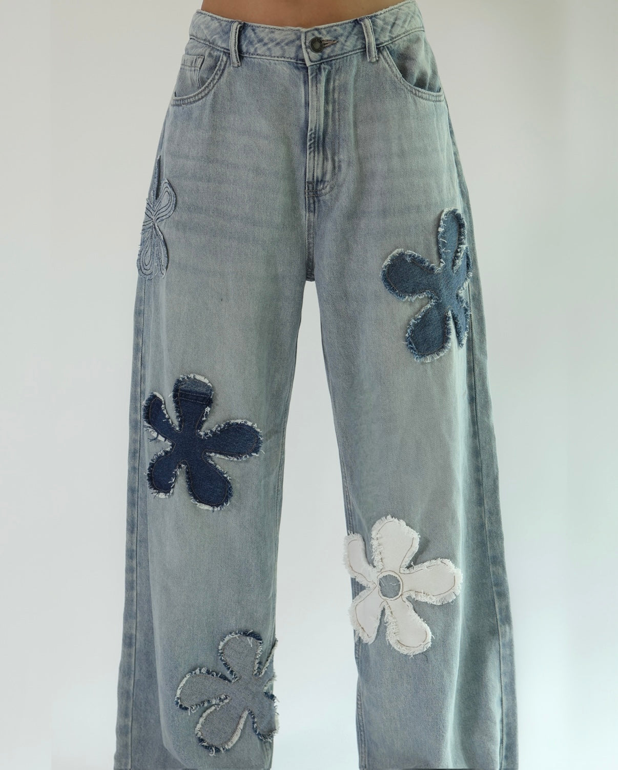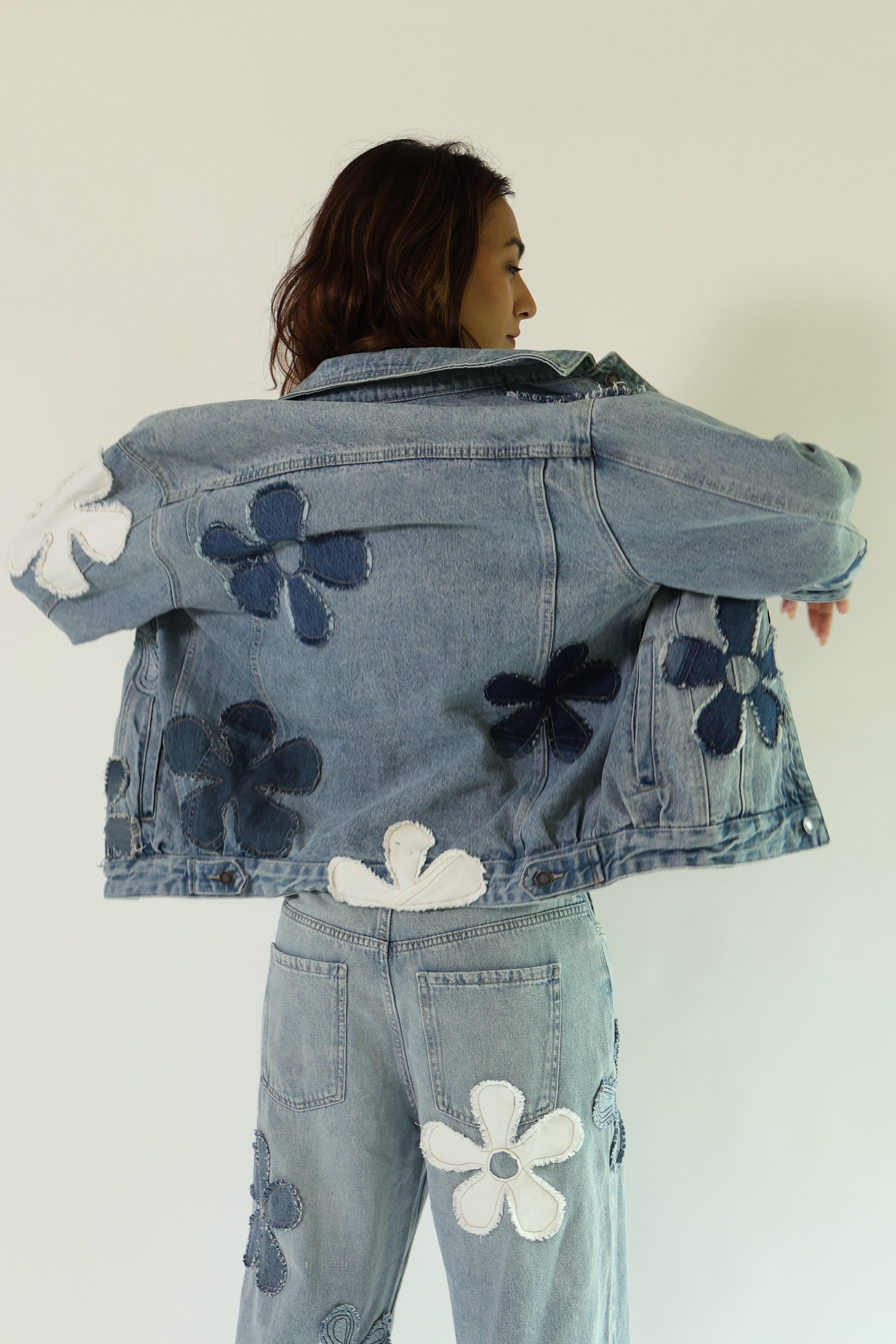 Process : Each flower is hand cut , placed strategically and upcycled with left over denim. After which each flower's edge is hand frayed to add more texture.