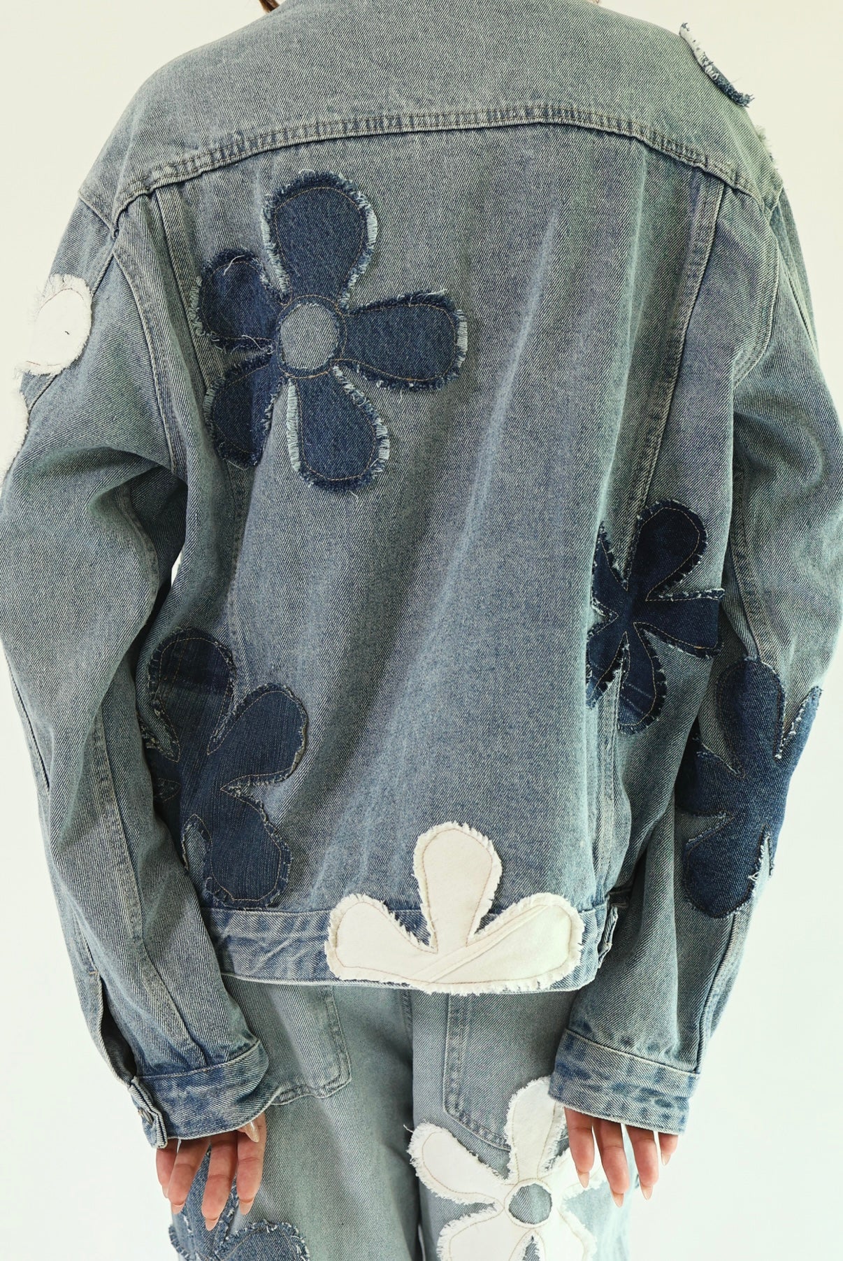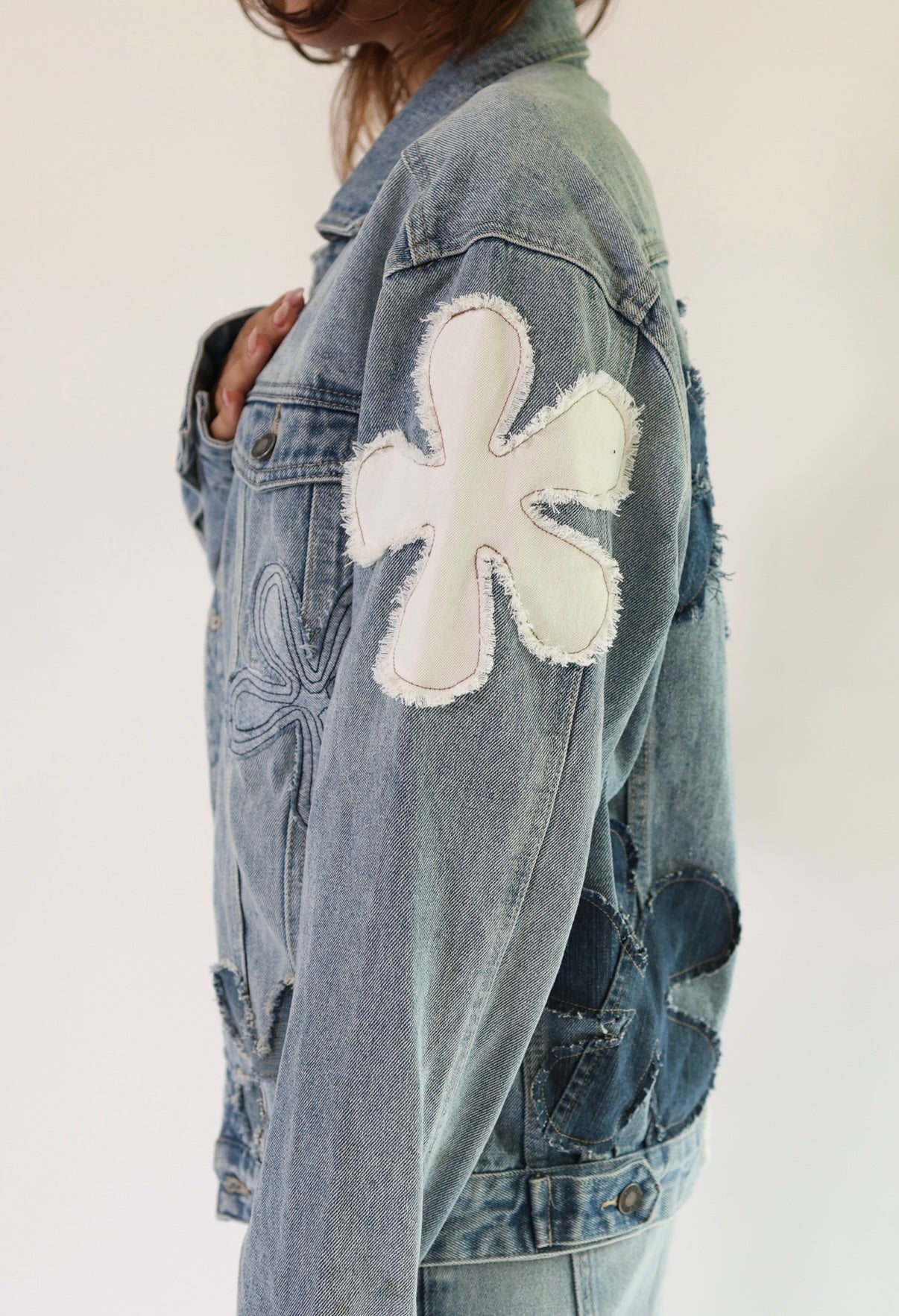 Process : Each flower is hand cut , placed strategically and upcycled with left over denim. After which each flower's edge is hand frayed to add more texture.